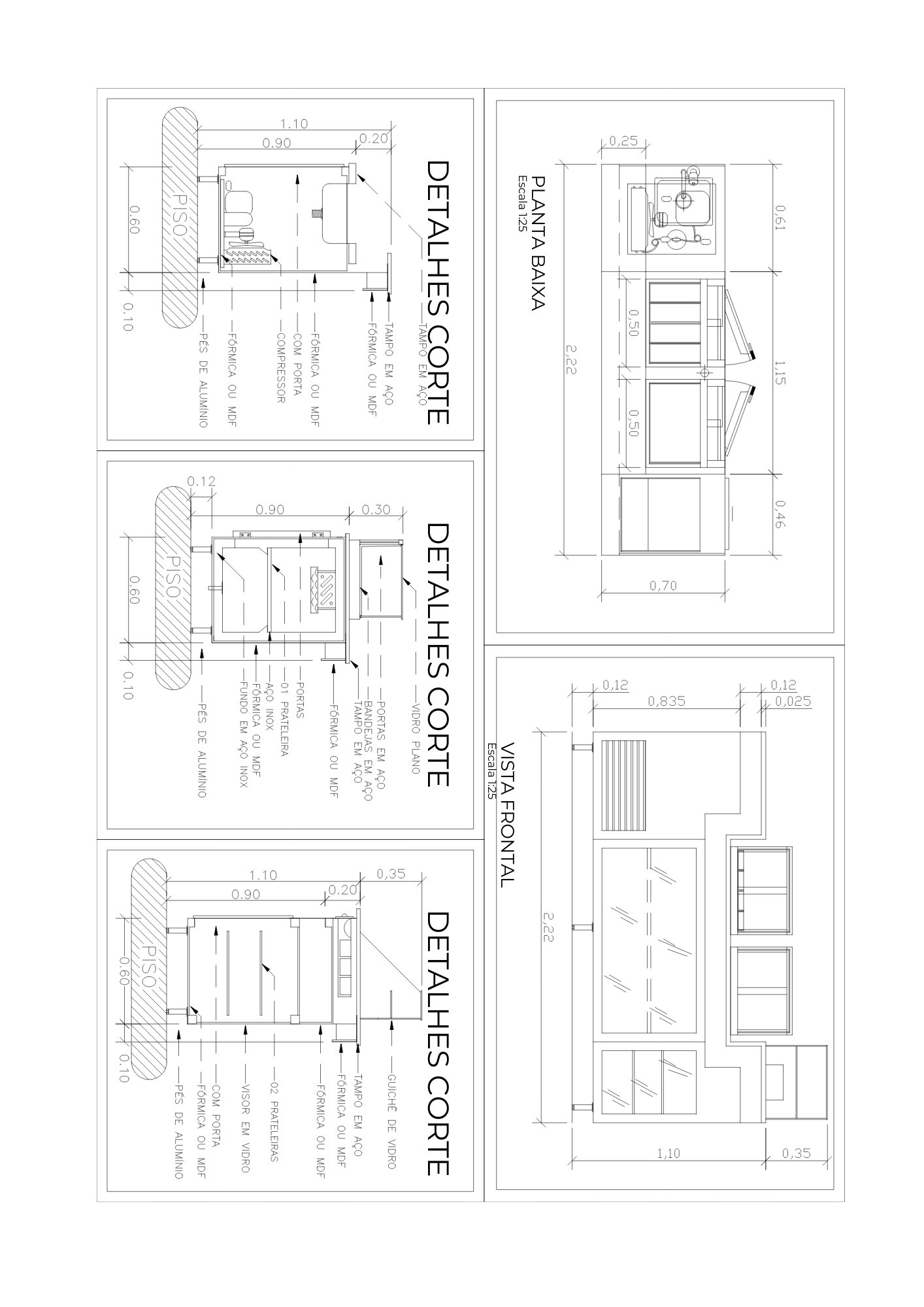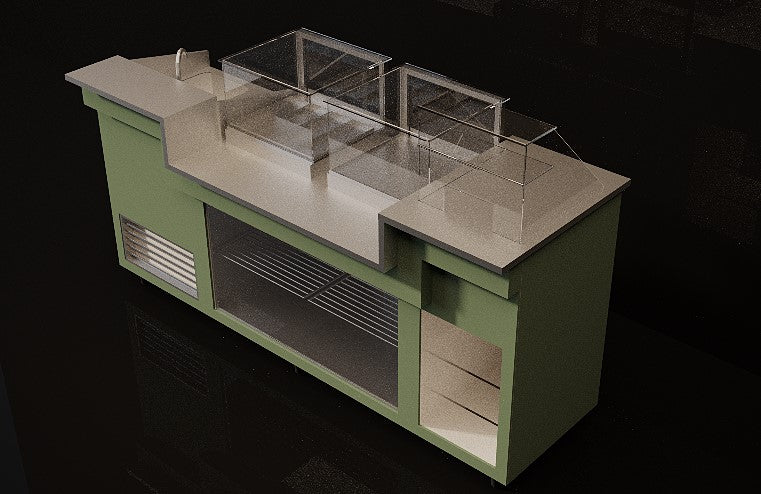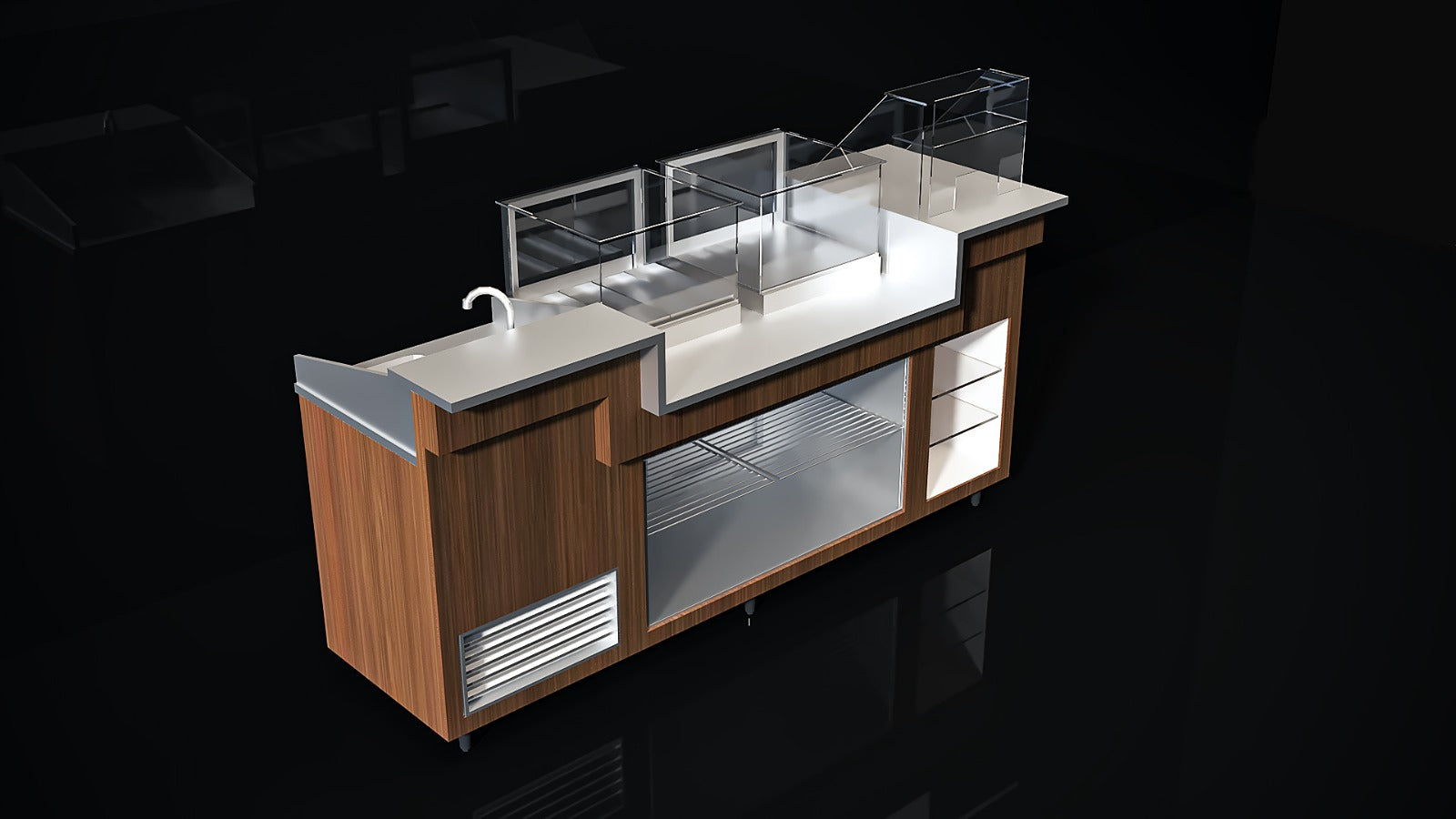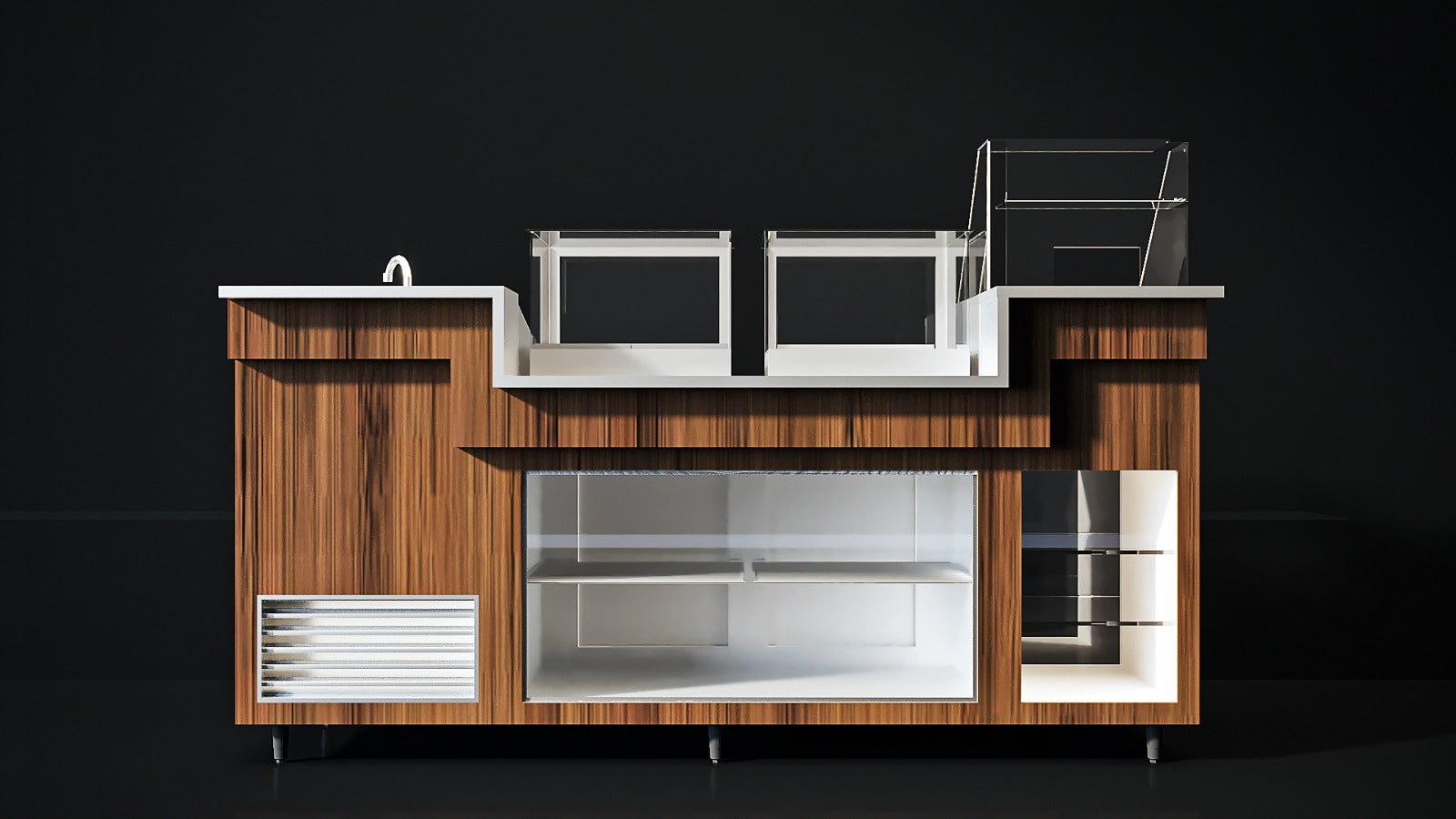 Frente de Lanchonete compacta com balcão refrigerado, caixa bomboniere, copa com PI, estufa quente, vitrine fria para doces e tortas.